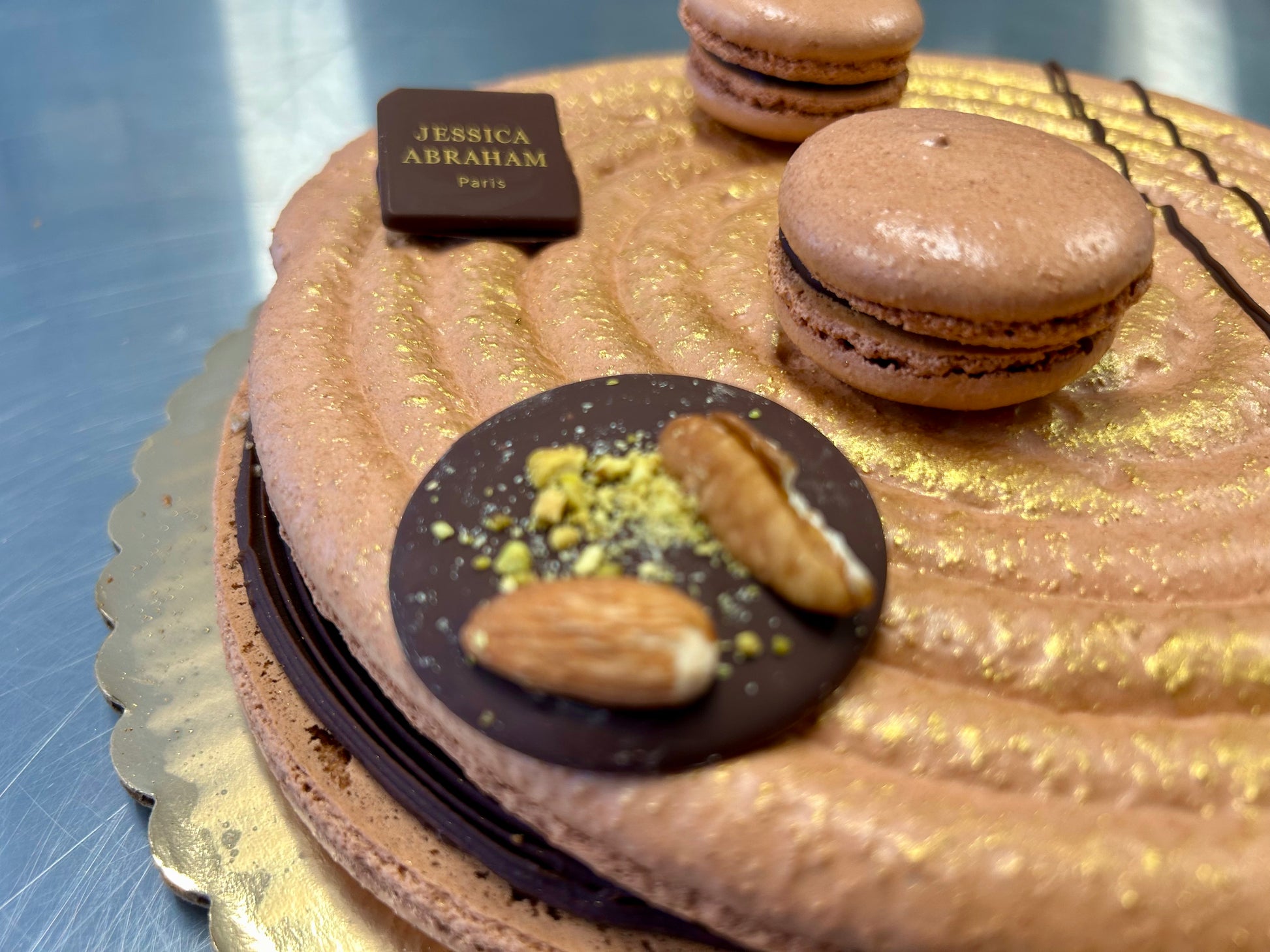 For macarons aficionados. Imagine a giant version of our chocolate macaron, filled with our rich chocolate ganache and a layer of crunchy praliné ( candied hazelnuts and almonds crushed into a paste ). Gluten free.