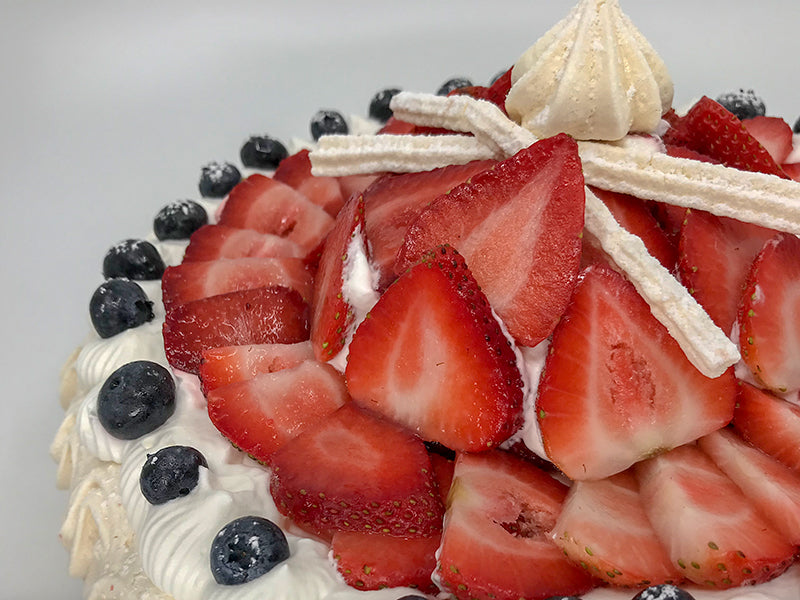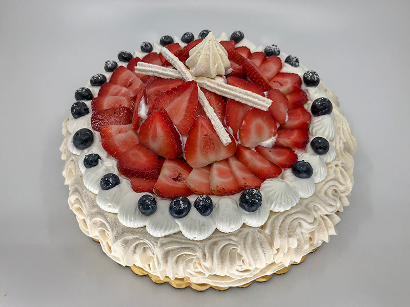 A crunchy meringue flower, with a center of light and fluffy Crème Chantilly ( french style whip-cream ), covered with fresh fruits. The dessert of the Russian Tsars and french Royalty.